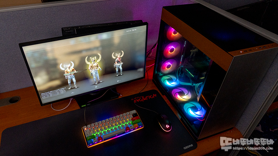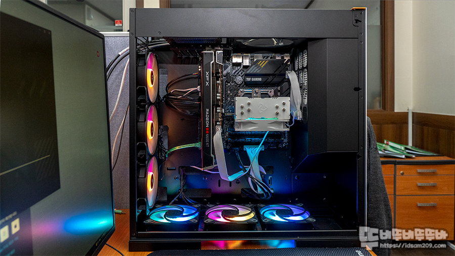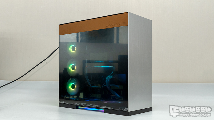 리버스 방식이기에 CPU 쿨러와 VGA가 케이스 상단으로 향하는 모습이며, 바닥면에 쿨링팬 3개는 흡기 (샤시 내부로 공기 유입), 케이스 뒷면은 배기 (샤시 밖으로 배출)하는 형태로 조립하였습니다.