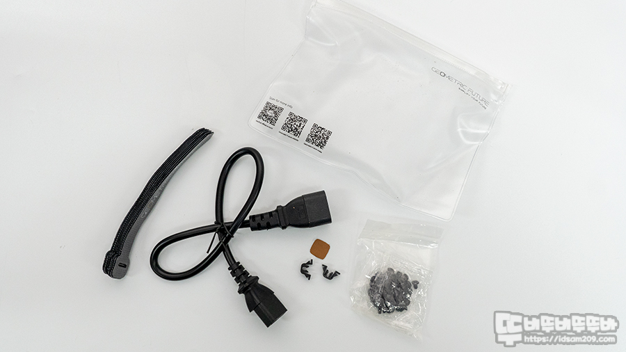 GEO메트릭퓨처 Model8 카우보이 튜닝 케이스에서 기본으로 제공하는 조립 부자재는 파워 연장선, 메인보드/SSD 조립용 둥근 접시 나사, 파워 서플라이 조립용 육각 나사, 메인보드 조립 용 육각 스탠드오프, HDD 고정 나사, 그리고 벨크로 타이로 구성되어 있으며, 여분으로 제공되는 부속품과 SSS 등급의 소가죽 샘플을 확인할 수 있네요.