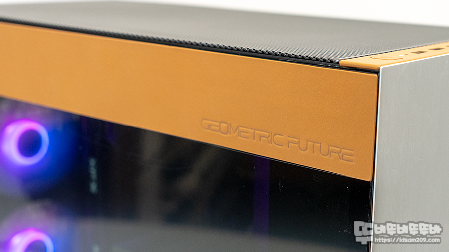 진한 스모그 느낌의 4T 강화유리 사이드 패널은 대칭형으로 디자인되었으며 케이스 정면 기준 왼쪽 사이드 패널에만 GEO메트릭퓨처로를 인쇄하여 좌우를 구분하고 있고요.