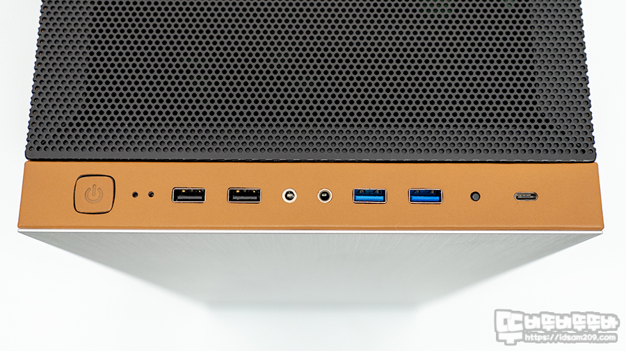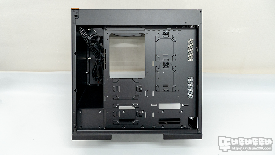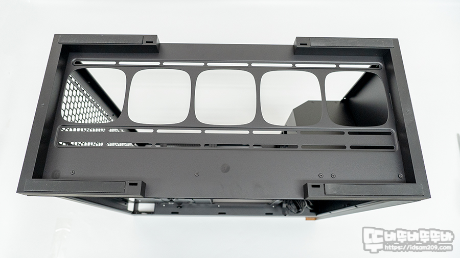 케이스 상단은 리버스 방식답게 그래픽 카드 출력 단자, 메인보드 I/O 포트, 파워 서플라이 전원 소켓을 연결하고 정리할 수 있는 공간으로 구성되어 있으며, 가로 방식 조립보다 세로 방식으로 조립 시 의외로 생각할 부분이 많아서 조금 버벅이게 되네요.