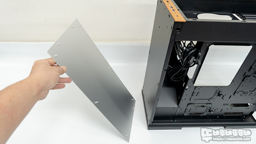 사이드 패널은 앞쪽에 프레임에 돌기를 부분을 샤시에 슬라이딩 방식으로 고정하고 뒤쪽에 4각 손나사로 고정하는 형태로 디자인되었습니다.