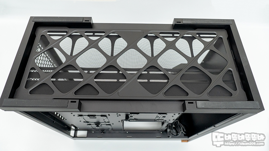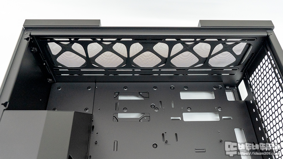 필터를 제거한 120/140mm 쿨러 및 120~400mm 라디에이터 장착이 가능한 샤시 모습.