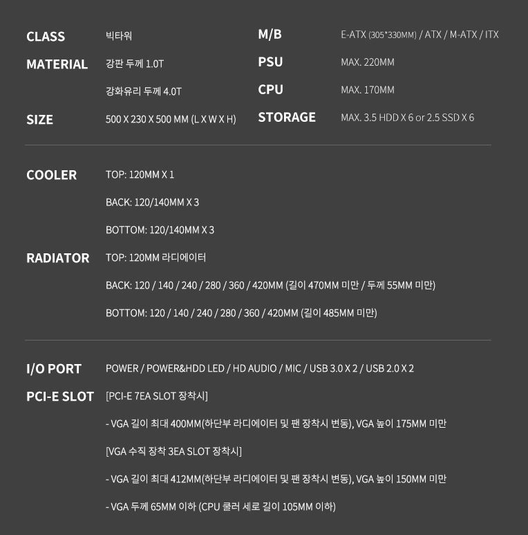 공홈의 미들 타워로 구분하는 것과 다르게 국내에서는 빅타워라고 소개하고 있으며 E-ATX 메인보드 지원, 1T 샤시 사용, 양쪽 4T 강화유리 사이드 패널 사용, 220mm 파워서플라이 수용, 측면 또는 바닥면에 420mm 라디에이터 장착 가능, 리버스 방식의 메인보드 장착하는 튜닝 케이스로 디자인된 게 특징입니다.