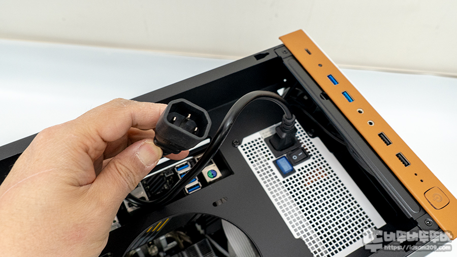 조립 자재 중 파워 서플라이 연장 케이블을 사용하기 위해서 사진과 같이 연결하고 파워 케이블을 꽉 연결하여 파워 코드가 빠지지 않게 해주어야 합니다.