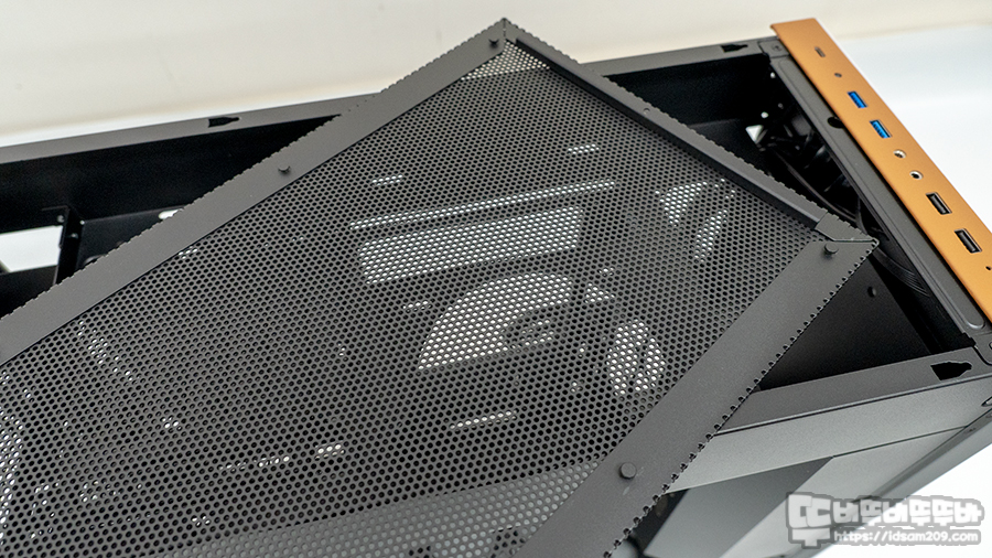 수냉 쿨러를 사용하는 경우 위의 사진과 같은 방식으로 조립하게 되니 상단 타공 커버를 닫는 것을 감안하여 워터 블록 호수를 잘 조절하셔야 할 거 같습니다.