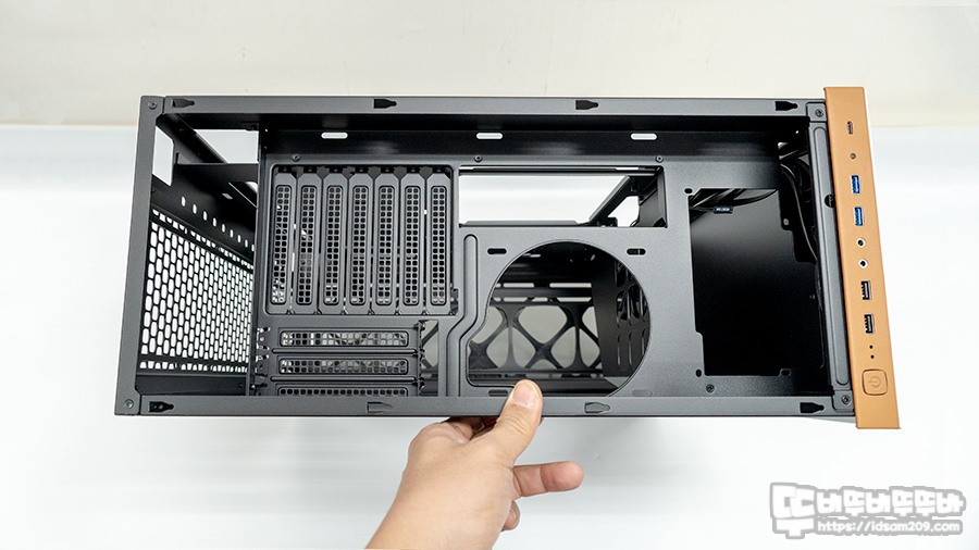 새시 내부에서 상단 쪽으로 살펴보면 7개의 PCI 슬롯 그리고 라이저 카드를 이용 시 사용 가능한 버티컬 슬롯 3개 그리고 120mm 쿨러와 수냉 쿨러 사용 시 워터 블록이 넘어올 수 있게 디자인된 모습을 확인할 수 있으며, 오른쪽 측면에는 220mm 사이즈 ATX 규격의 파워서플라이 장착이 가능한 공간을 따로 제공하고 있습니다.
