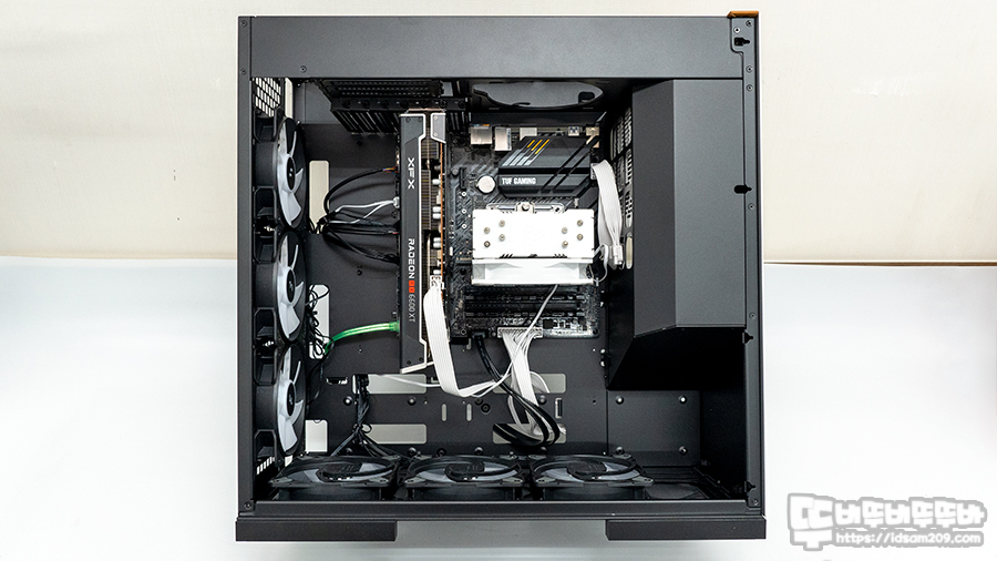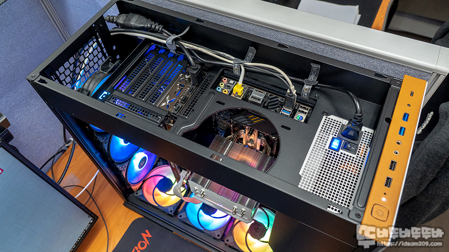 리버스 방식이기에 CPU 쿨러와 VGA가 케이스 상단으로 향하는 모습이며, 바닥면에 쿨링팬 3개는 흡기 (샤시 내부로 공기 유입), 케이스 뒷면은 배기 (샤시 밖으로 배출)하는 형태로 조립하였습니다.