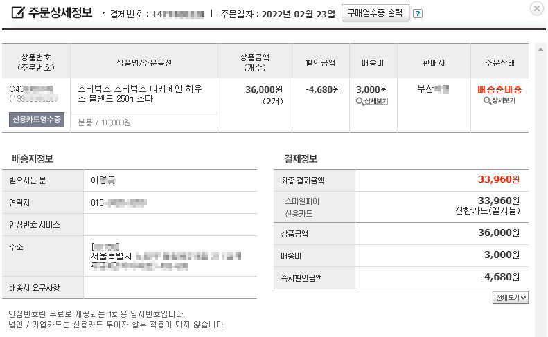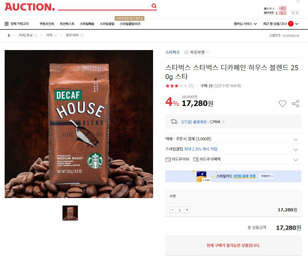 인터넷에서 구입하려고 했는데 매장 정가 18,000원짜리가 2만 원 이상 금액에 판매되길래 계속해서 검색을 하다가 옥션에서 저렴하게 구입하는 곳을 발견하고 250g Decaf Blend 원두를 2개 주문을 하였습니다.
