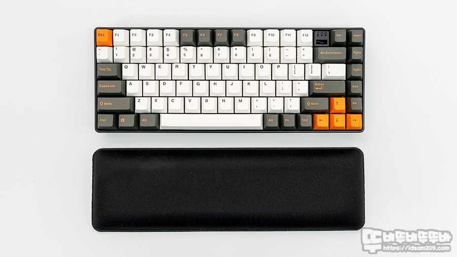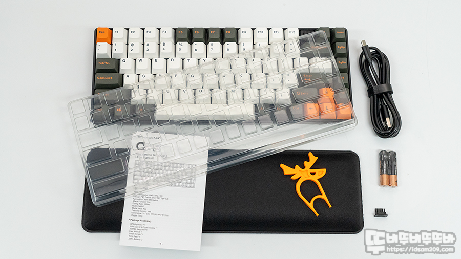 AAA 건전지 2개를 내장한 Q75 키보드 무게는 약 786g으로 75% 배열의 미니 배열 키보드 치고 슬림한 편이라 휴대성이 좋은 편이며, 기본 구성품으로 제공하는 팜레스트는 쿠션감이 있어서 편안하게 사용할 수 있습니다.