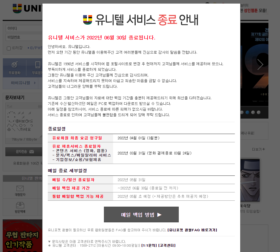 솔직히 지금까지 유지된건 PC통신이 아닌 웹 브라우징 서비스였는데 이마저도 종료된다는 이야기입니다.