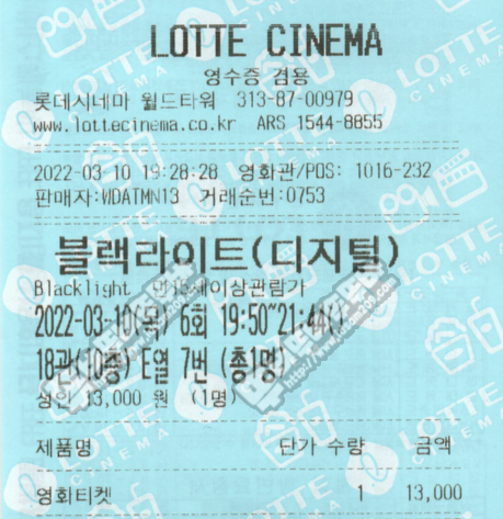 장소 : 롯데시네마 월드타워 18관 E열 7번