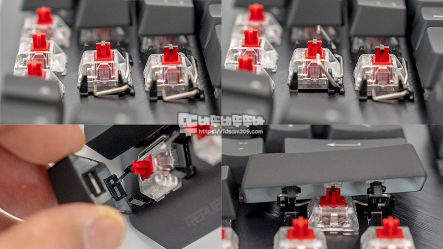 키캡 탈부착 시 위의 사진과 같이 스태빌라이저를 위로 들어 올린 상태에서 한쪽을 걸어주면서 스템이 걸친 쪽을 살짝 밀어 반대편을 걸어주면 손쉽게 장착이 가능하니 너무 어려워하지 마시고 천천히 작업하시기 바랍니다.