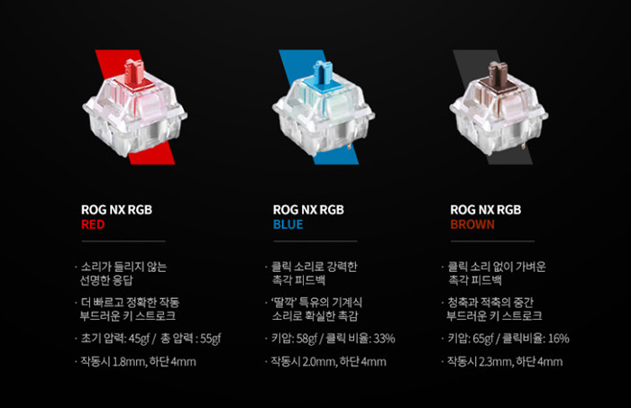 체리 갈축 키압 55g, 작동 시 2.0 mm / ROG NX 갈축 키압 58g, 작동 시 2.0 mm