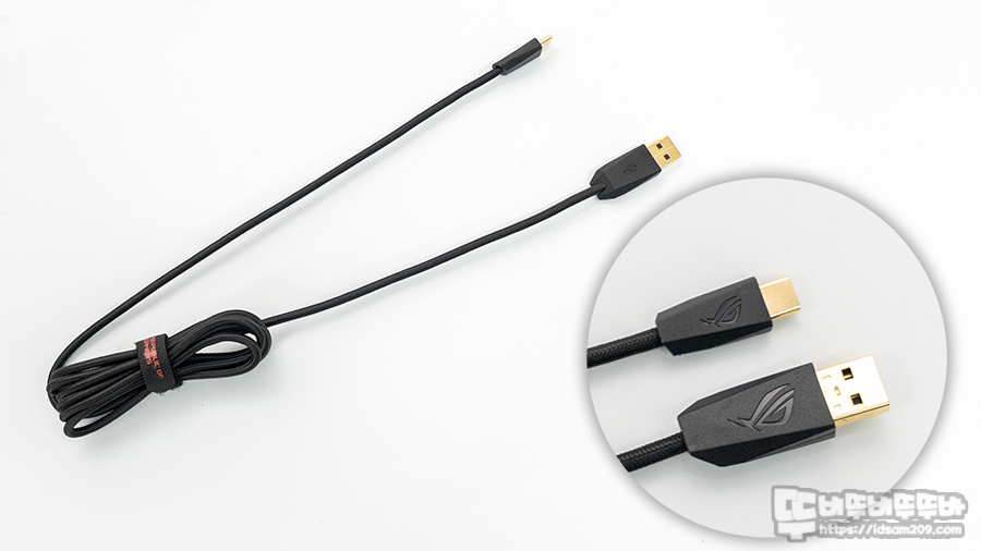 패브릭 소재가 사용된 케이블은 USB-C와 USB-A 단자 몰딩에 ROG 로고 모습을 확인할 수 있어 PC에 연결했을 때 몰딩의 로고를 보고 ASUS ROG STRIX SCOPE NX TKL이 연결된 것을 빠르게 확인할 수 있습니다.