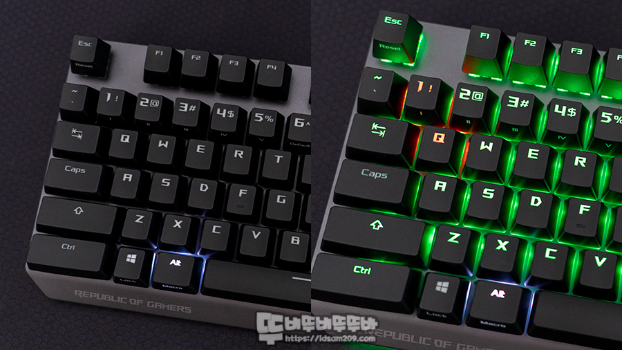 아무래도 표준 배열이 아니다 보니 키캡 놀이에 제한이 있는 편이지만, 유통사에서 ASUS ROG PBT KEYCAP SET를 별도로 판매하고 있으니 ABS 키캡이 불편하신 분들은 참고하시기 바랍니다.
