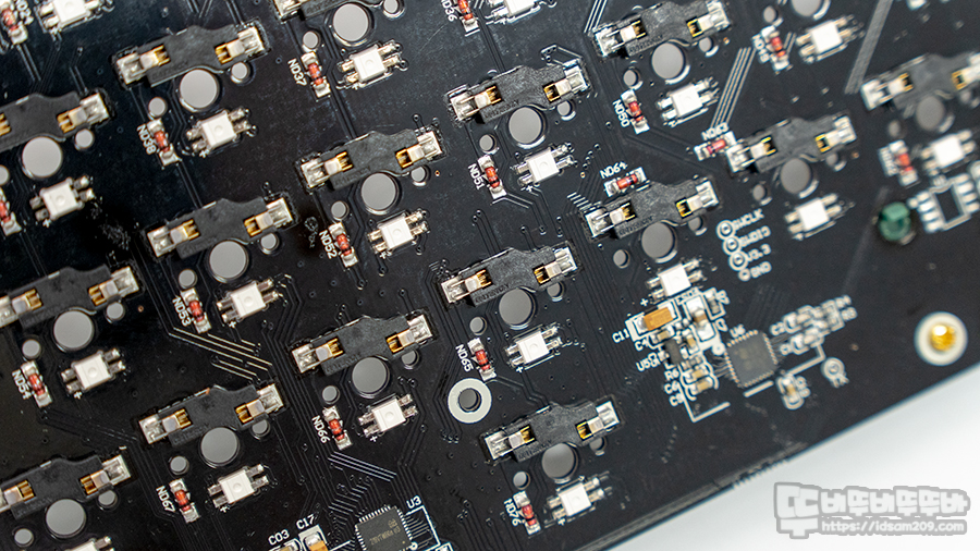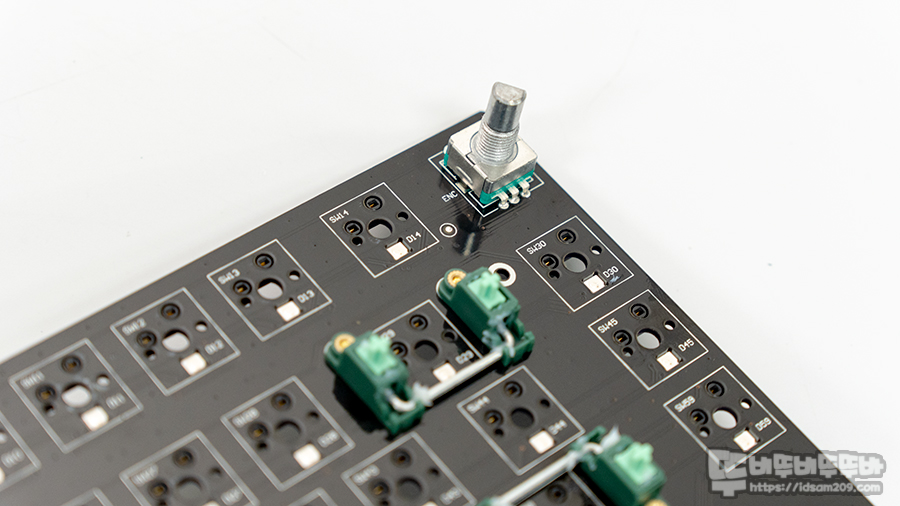 핫스왑 소켓이 적용된 기판은 스위치 교체를 편하며 스위치 다리가 각도가 휘어있는 상태에서 무리하게 결합 시 납 땜 되어 있는 소켓이 떨어질 수 있으니 스위치 장착 시 다리가 직선을 유지하는지 꼼꼼하게 확인하시고 장착하시기 바랍니다.