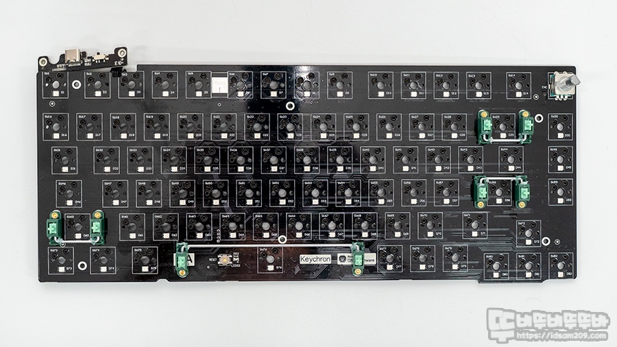 Keychron Q1 Knob의 독특한 점이라면 기판이 알루미늄 하우징 상판 또는 하판에 결합되는 형태가 아닌 보강판 위/아래에 가스킷을 부착하여 알루미늄 하우징 상하판 사이에 샌드위치 형태로 안착되는 디자인이 적용되었습니다.