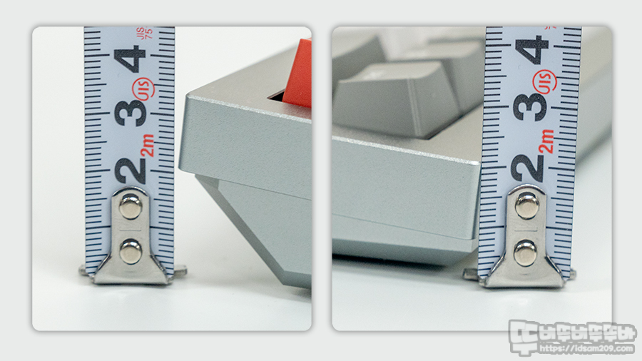 CNC 가공으로 설계된 5.2도의 경사각으로 디자인된 알루미늄 하우징은 키보드 하단 열의 일반적인 기성품보다 높은 약 21mm로 높이로 편안한 타이핑을 위해서는 팜레스트가 필요할 거 같네요.