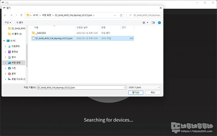 먼저 우측 상단에 File - 열기를 이용하여 기본 배열 파일인 Q1_knob_ANSI_VIA_keymap_V2.0.2.json 파일을 열면 VIA 프로그램을 진행합니다.