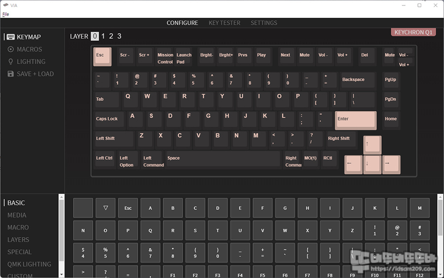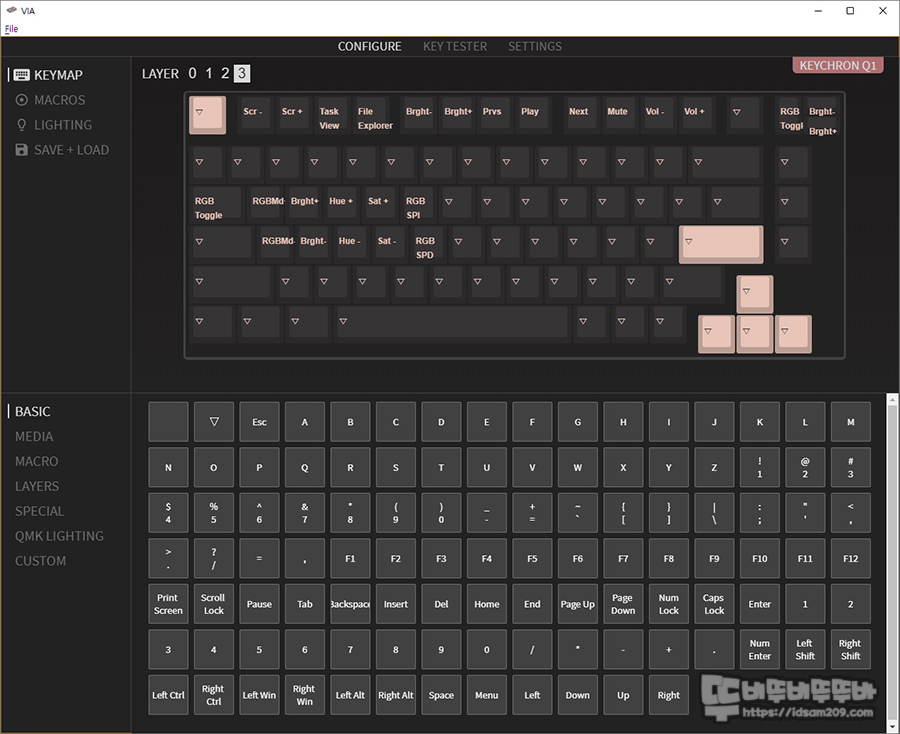 기본적인 메뉴 구성으로는 왼쪽 상단에 Keymap / Macros / Lighting / Save+Load 메뉴 그리고 왼쪽 하단에는 Keymap에 해당하는 Basic / Meida / Macro / Layer / Special / QMK Lighting / Custom으로 구성되어 있습니다.