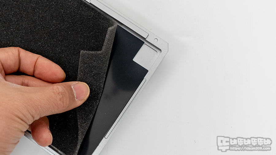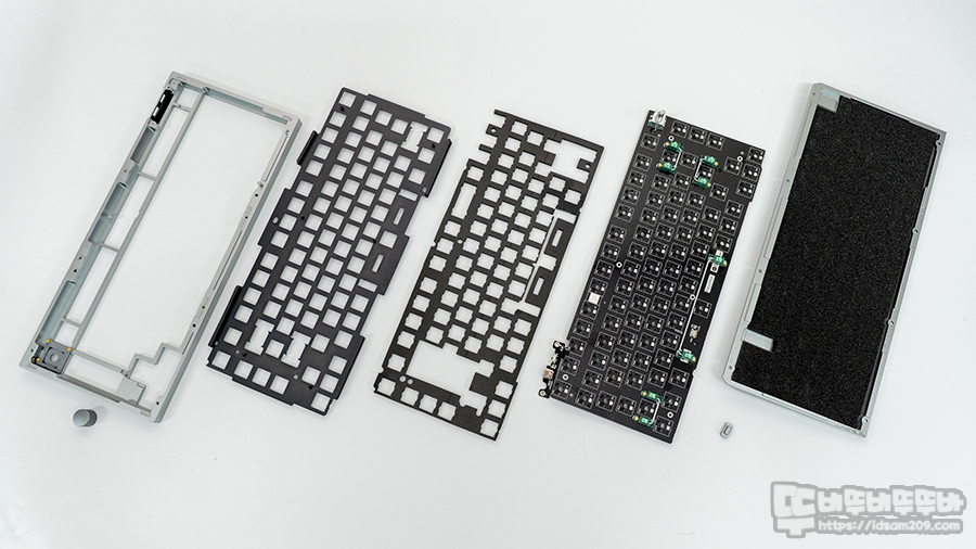 왼쪽부터 알루미늄 상판 프레임, 보강판, 가스킷, 기판, 흡음재가 부착된 알루미늄 하판으로 구성되어 있습니다.
