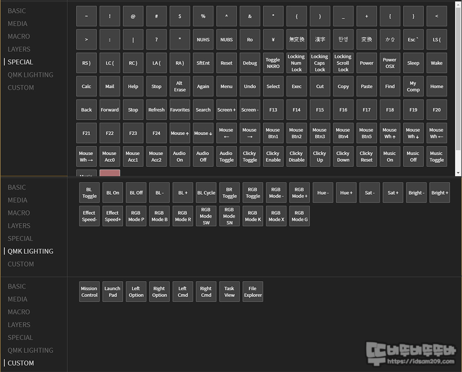 하단 메뉴의 Basic / Meida / Macro / Layer / Special / QMK Lighting / Custom의 각각의 메뉴에 다양한 기능이 있어 천천히 살펴보시고 적응하시기 바랍니다.