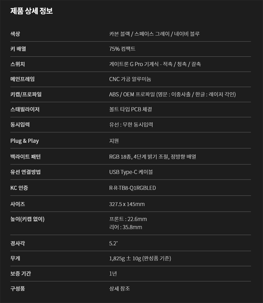 풀 패키지 모델의 경우 게이트론 G Pro 스위치를 사용하고 있는데 적축 스위치의 경우 45g 키압 / 청축 60g / 갈축 55g의 키압을 가지고 있습니다.