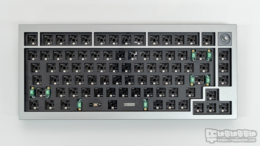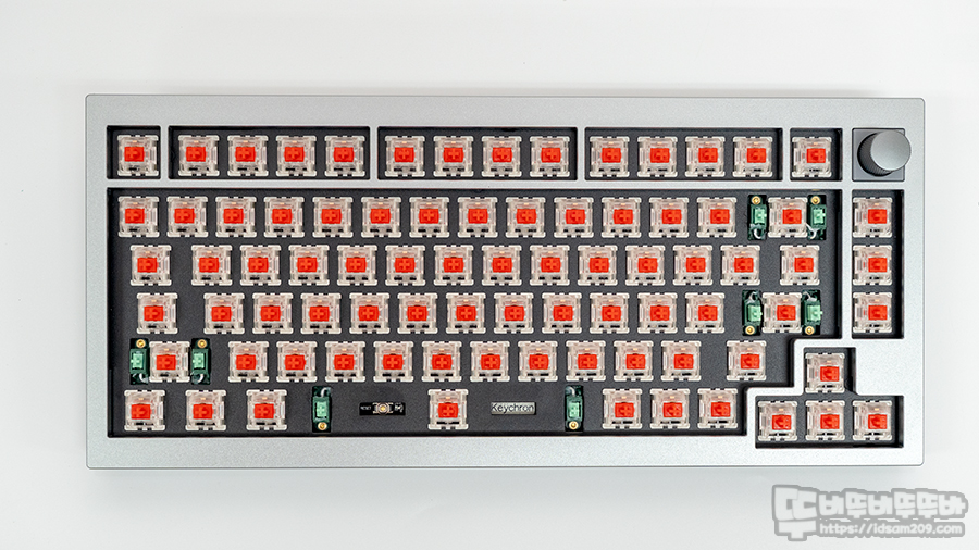 Keychron Q1 Knob의 독특한 점이라면 기판이 알루미늄 하우징 상판 또는 하판에 결합되는 형태가 아닌 보강판 위/아래에 가스킷을 부착하여 알루미늄 하우징 상하판 사이에 샌드위치 형태로 안착되는 디자인이 적용되었습니다.