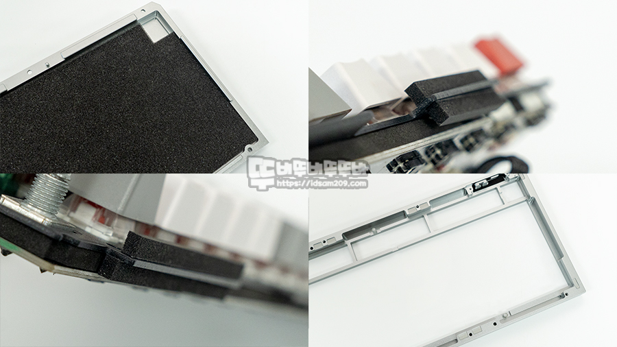 보통 하우징에 보강판을 나사로 고정하는 경우 발생하는 통울림을 가스킷으로 완충하는 설계가 적용되어 타이핑 시 크게 느껴지지 않지만 손바닥으로 키캡을 누르면 보강판이 눌려지는 게 느껴져지는데 이런 부분은 유저의 성향에 따라 호불호가 있을 거 같습니다.