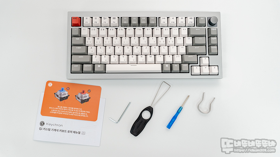 Keychron Q1 Knob 프리미엄 QMK/VIA 알루미늄 커스텀 키보드는 본체만 구성된 베어본과 스위치와 키캡이 포함된 풀 패키지로 판매되며, 필자가 리뷰하는 제품은 게이트론 G pro 적축 스위치가 사용된 풀 패키지 제품을 리뷰하니 참고하시기 바랍니다.