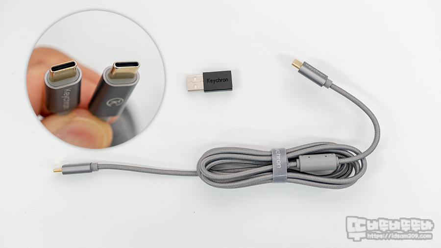 Keychron Q1 Knob 본체, 육각 렌치, 키캡 리무버, 십자드라이버, 스위치 리무버, 윈도우즈용 교체 키캡, 여분의 스펀지 가스킷, 기판 쪽에서 고정 및 스태빌라이저 고정용 여분의 나사, 하우징 고정 나사, 실리콘 범폰 그리고 탈착형 USB-C 케이블과 USB-C to A 젠더로 구성되어 있습니다.