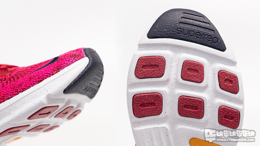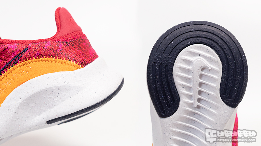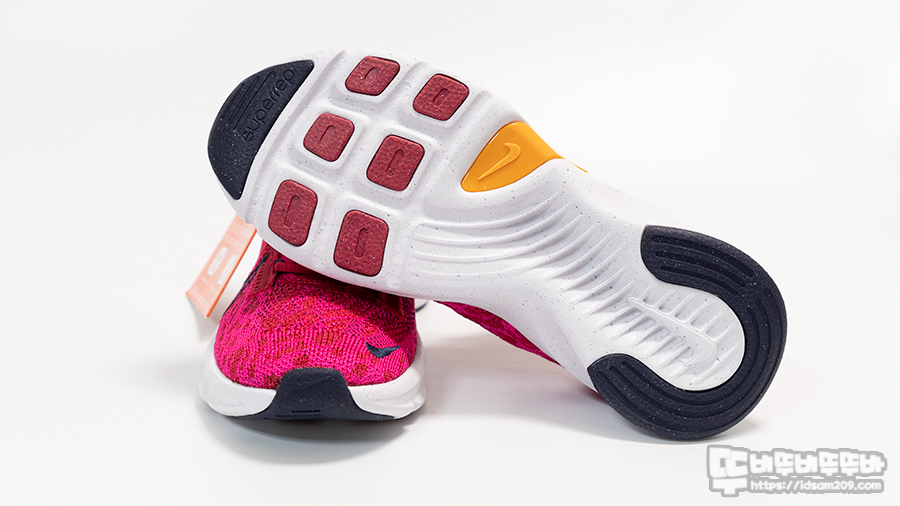 나이키 슈퍼렙 고 3 플라이니트 무게 기준 20% 이상 재생 소재로 제작되었다고 설명하고 있는데 주로 바닥면에 미세하게 분쇄된 재생 폼을 사용하고 있는 게 특징입니다.