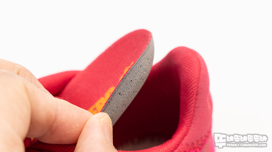 깔창은 발을 감싸는 폼과 천이 겹진 형태이며 내부의 바느질은 촘촘하게 되어있습니다.