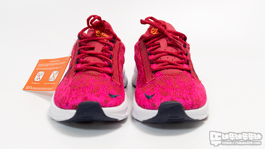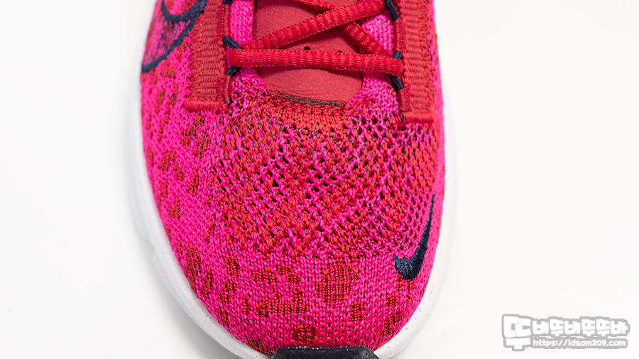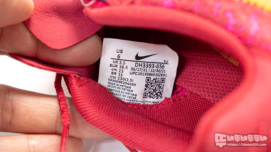 이처럼 신발의 갑피 부분은 발을 감싸는 부분은 촘촘하게 발등 부분은 구멍이 송송 뚫리는 뜨개질 느낌으로 디자인하여 통기성을 좋게 하였지만 더불어 비가 올 때엔 방수에 취약한 단점이 있을 수 있네요.