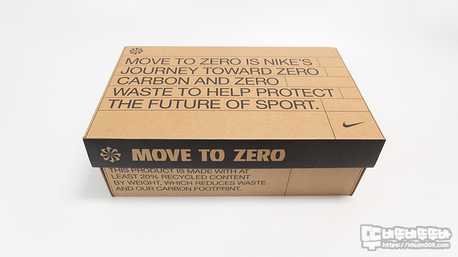 패키지 박스에 인쇄된 무브 투 제로(Move to Zero)’ 는 "기후 변화로부터 스포츠의 미래를 보호하는 것"이라는 나이키의 캠페인으로 제로 탄소와 제로 폐기물을 위해 20% 이상 재활용 소재가 사용된 제품임을 알 수 있습니다.