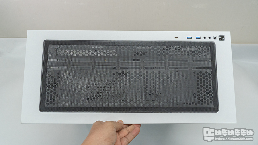 케이스 상단을 살펴보면 고무자석을 이용한 탈부착이 가능한 먼지 필터 그리고 120/140mm 쿨링팬 또는 최대 360mm 수랭 쿨러 장착이 가능한 가이드 홀을 확인할 수 있네요.