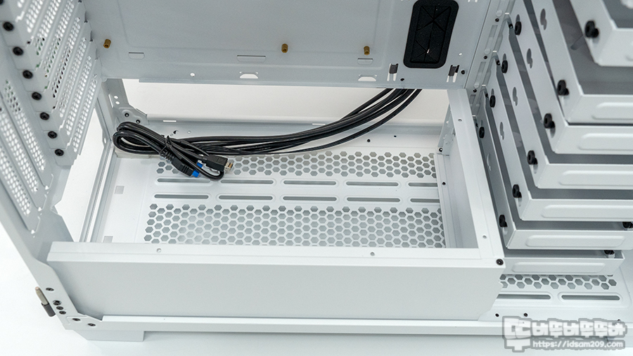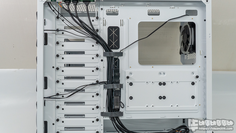 샤시 내부를 살펴보았을 때 특징이라면 샤시 중앙 부분에 케이블 정리 홀을 가려주는 실리콘 커버 모습과 8개의 PCI 가이드 및 가로로 사용 가능한 3개의 PCI 가이드를 확인할 수 있으며 파워서플라이를 장착하는 공간의 타공 처리된 샤시가 눈에 띕니다.