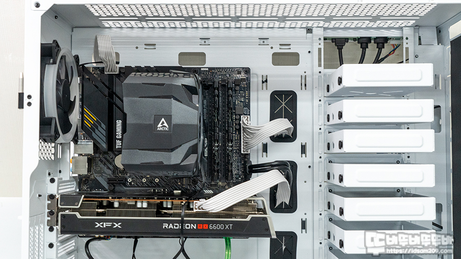 M-ATX 메인보드 구성이라 꽤 널널한편인데 상단 또는 전면에 수랭 쿨러를 사용할 경우 필요에 따라 전면 베이를 분리하여 사용하시는 것도 방법이니 참고하세요.