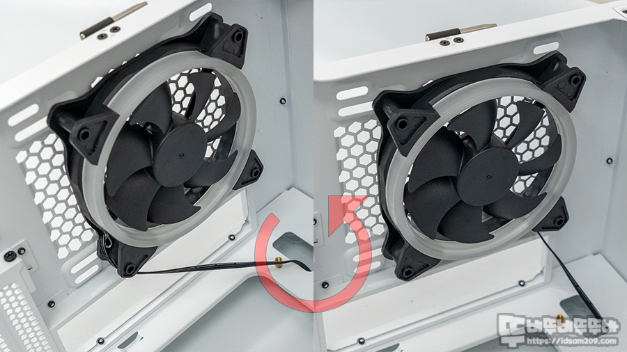 샤시 후면에 120mm 쿨러의 경우 왼쪽 사진과 같이 조립이 되어있는데 메인보드를 장착하는 경우 I/O포트 또는 히트싱크에 케이블 걸릴 수 있기에 오른쪽과 같이 돌려주시면 메인보드 장착 및 케이블 정리하는데 도움이 됩니다.
