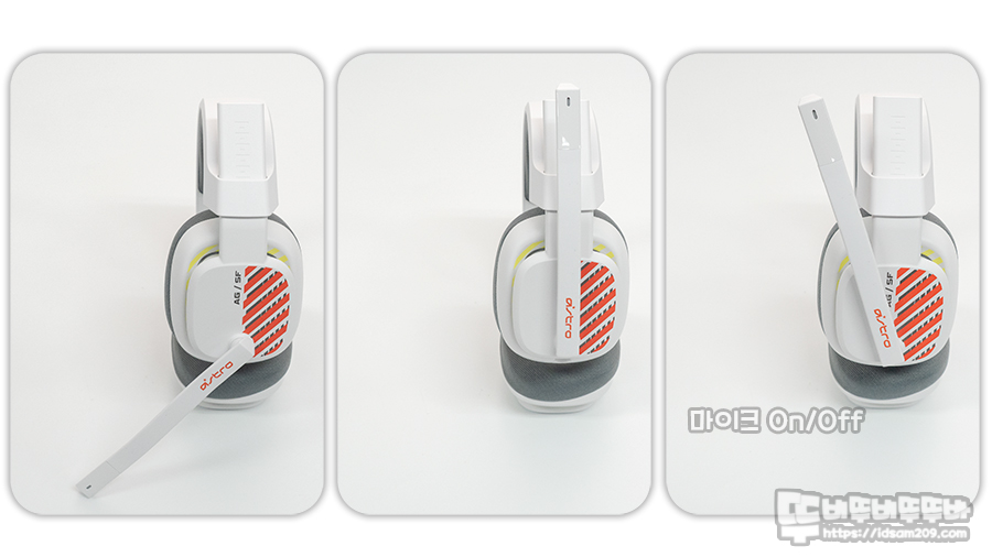로지텍 ASTRO(아스트로) A10 GEN2의 탈착형 케이블에는 마이크 제어 기능이 없으며 붐 마이크를 위/아래로 움직이는 플립 방식으로 마이크 On/Off를 지원하는데 사진의 오른쪽 위치에서 마이크 On/Off가 작동하게 되며 명확하진 않고 약간의 구분감이 느껴집니다.