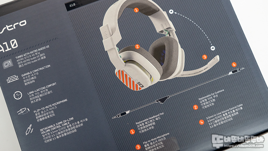 아스트로 오디오 V2 튜닝, 우수한 내구성, 오래가는 편안함, 플립 방식의 음소거 마이크, 탈착형 3.5mm 케이블과 헤드셋 구성에 대한 정보를 확인할 수 있습니다.