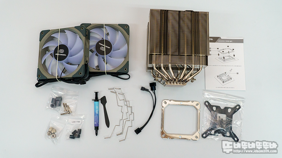제품은 듀얼 타워 히트싱크, 듀얼 120mm 쿨러, 인텔용 백플레이트, 쿨러 장착 브라켓, PWM Y자 케이블, 팬 고정 클립 2세트, 써멀구리스 (12.4W/mk), 스크래퍼, 조립용 부자재(스탠드오프[인텔-검정 | AMD-회색], 고정 나사, 너트), 사용설명서로 구성되어 있습니다.