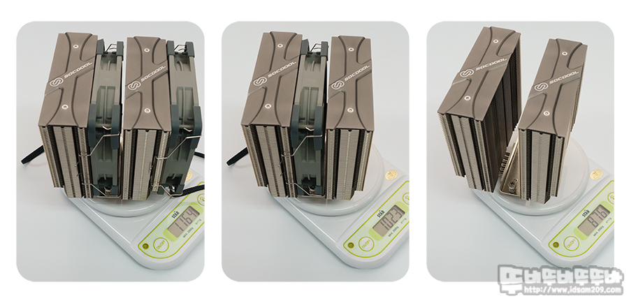 1g 단위로 측정할 수 있는 디지털 저울로 무게 측정 시 히트싱크와 2개 쿨러 조합의 경우 약 1.16Kg, 1개 쿨러 조합 시 약 1.02kg, 히트싱크 베이스의 경우 약 876g 무게를 확인할 수 있었습니다.
