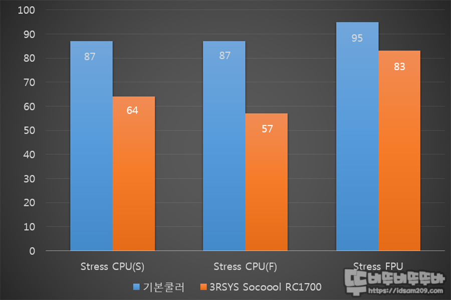 싱글 타워 방식의 쿨러와 비교해 보아도 확실하게 듀얼 타워 방식인 3RSYS Socoool RC1700이 안정적인 성능을 보여주고 있는데요.