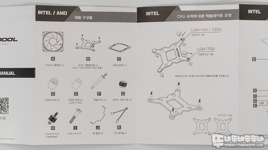 제품은 듀얼 타워 히트싱크, 듀얼 120mm 쿨러, 인텔용 백플레이트, 쿨러 장착 브라켓, PWM Y자 케이블, 팬 고정 클립 2세트, 써멀구리스 (12.4W/mk), 스크래퍼, 조립용 부자재(스탠드오프[인텔-검정 | AMD-회색], 고정 나사, 너트), 사용설명서로 구성되어 있습니다.