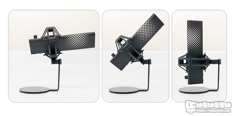 쇼크 마운트는 책상 위에 앉아 있는 사용자가 편하게 사용할 수 있게 90도 범위에서 다양한 각도 조절이 가능하며 쇼크 마운트에 3/8인치 나사홀을 지원하기에 동일 규격의 마이크 전용 스탠드에 연결도 가능합니다.