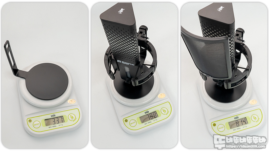 제품의 무게를 살펴보면 철재 스탠드 무게는 약 337g, 쇼크 마운트와 마이크가 결합된 스탠드 무게는 약 788g, 여기에 팝필터가 추가되면 814g, 스탠드를 제외한 마이크+팝필터+쇼크 마운트의 무게는 약 477g이니 거치대 이용 시 참고하시기 바랍니다.