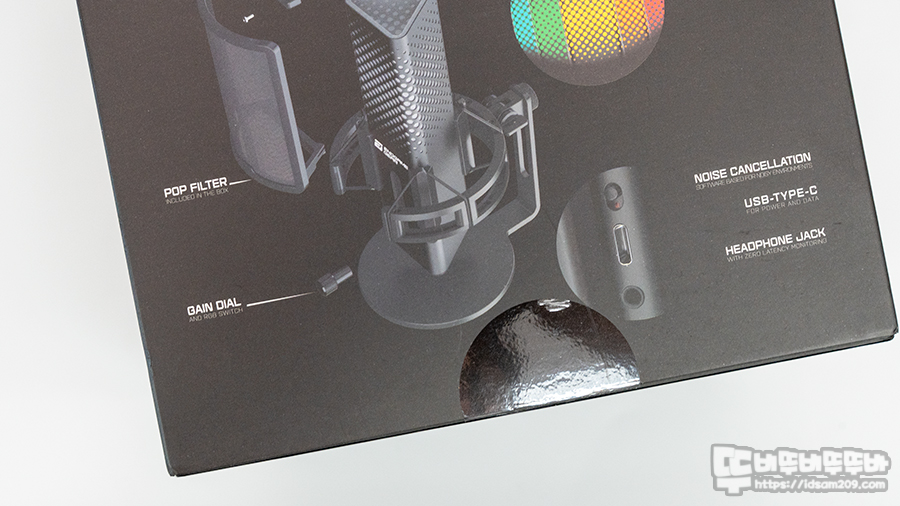 리얼 골드 도금 일렉트릭 콘덴서 / AI 노이즈 캔슬링 / GAIN LED 인디케이터 / 24비트 192kHz 샘플링 레이트 / 쇼크 마운트 / RGB 라이팅 등 제품의 특징으로 잘 표현하고 있습니다.