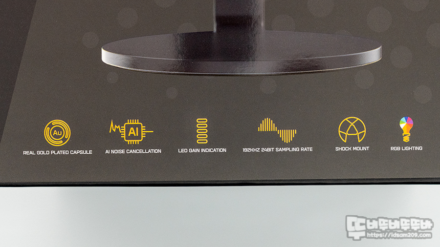 리얼 골드 도금 일렉트릭 콘덴서 / AI 노이즈 캔슬링 / GAIN LED 인디케이터 / 24비트 192kHz 샘플링 레이트 / 쇼크 마운트 / RGB 라이팅 등 제품의 특징으로 잘 표현하고 있습니다.