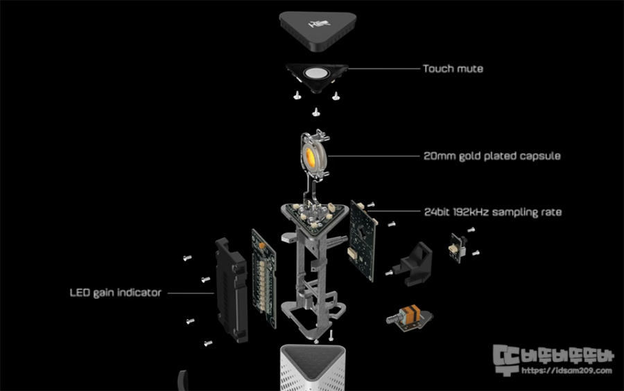 삼각형 디자인 하우징 전면에 위치하는 20mm 리얼 골드 도금 일렉트릭 콘덴서는 전문 녹음 스튜디오급의 마이크의 성능 선명한 음성 수음을 지원합니다.